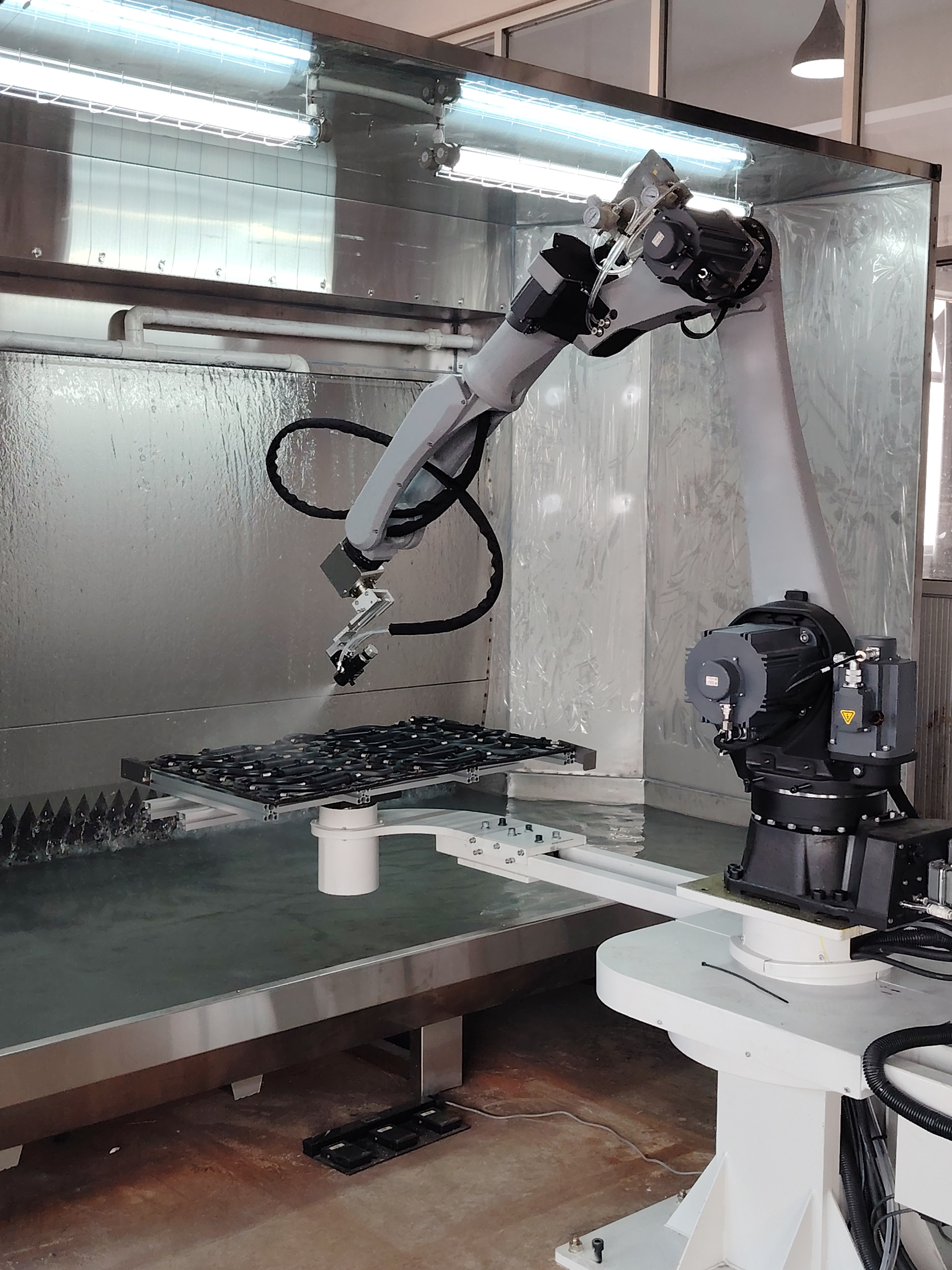 本款转台喷涂机器人采用双工位转台设计,支持 180° 工位旋转切换,可实现连续交替喷涂作业。一个工位进行喷涂工序时,另一个工位可同步开展工件上下料操作,以此达成无间断生产。双工位交替运作的模式,不仅大幅提升生产效率,更能保障喷涂质量的稳定性与一致性。